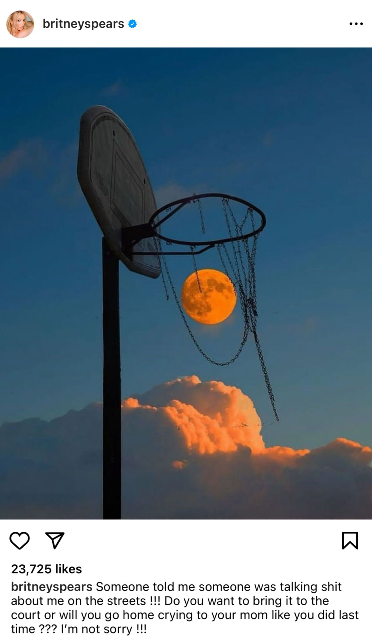 "¿Quieres llevarlo a la corte o irte te irás llorando a tu casa con tu mamá como lo hiciste la última vez? ¡No lo siento!", continuó Britney Spears, aparentemente retractándose de sus disculpas anteriores.