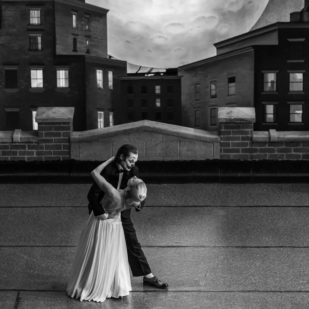 Mientras tanto, la segunda muestra a la pareja juntando sus narices a través de los barrotes de la prisión de Joker. Y finalmente, la última imagen los muestra bailando juntos en una azotea.