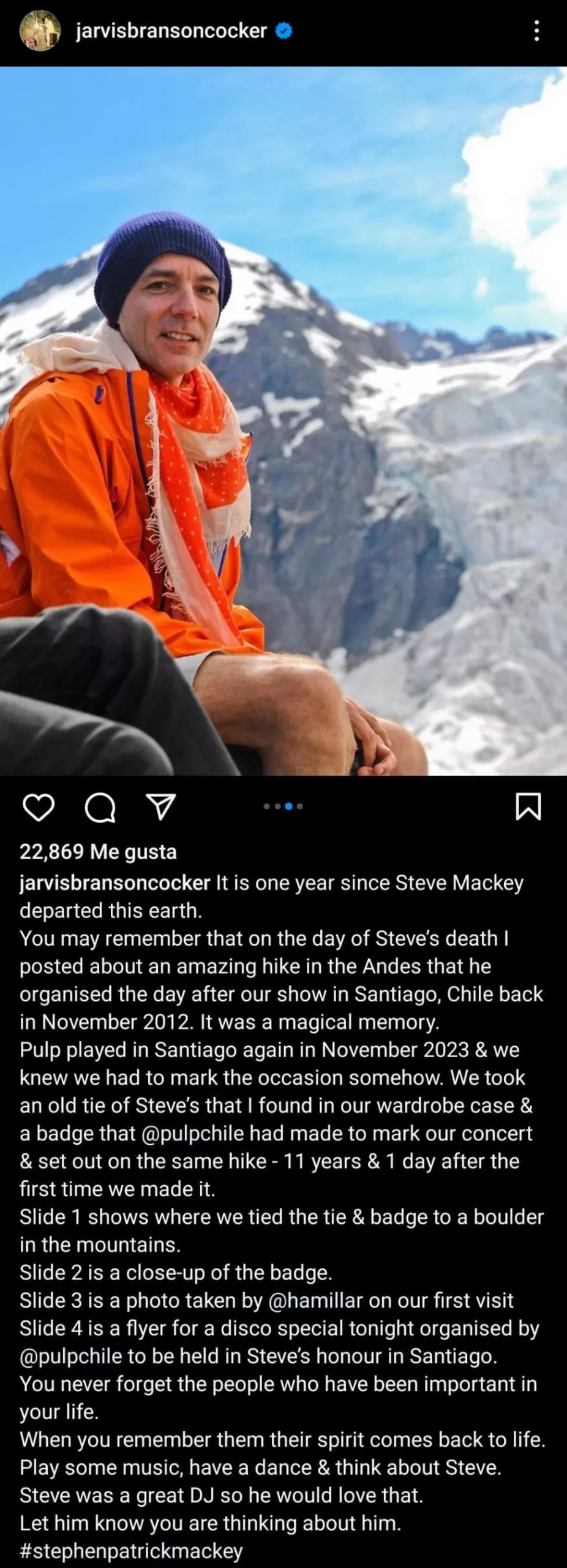 Relacionado a esto; hoy, el cantante de la agrupación, Jarvis Cocker quiso honrar la muerte del bajista, Steve Mackey. Hace un año que ocurrió la partida y a modo de tributo publicó unas fotos en la Cordillera de Los Andes. Causando mucho revuelo en sus redes sociales.