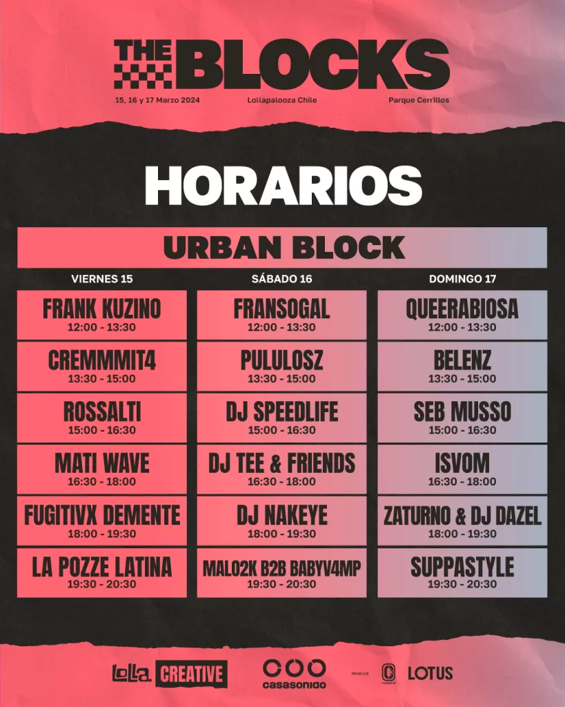 El “Urban Block” celebrará los 50 años del Hip Hop, un estilo que ha hecho historia en Lollapalooza Chile y el mundo. Junto con artistas como: La Pozze Latina, Zaturno, DJ Tee & Friends, Suppastyle, DJ Nakeye, junto a muchos más animarán esta tremenda fiesta.