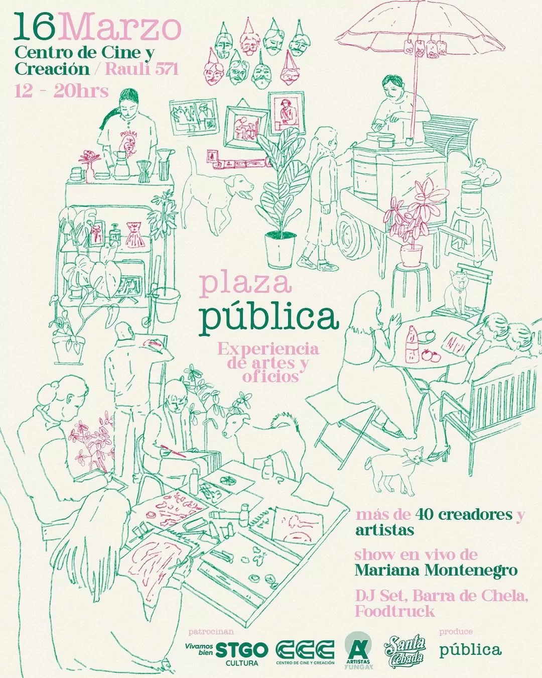 El evento Plaza Pública se realizará el día sábado 16 de marzo, en un horario que comprende entre las 12:00 y las 20:00 hrs. Tendrá lugar en el Centro de Cine y Creación (Cine CCC), ubicado en calle Raulí 571, a pasos del metro Santa Isabel.