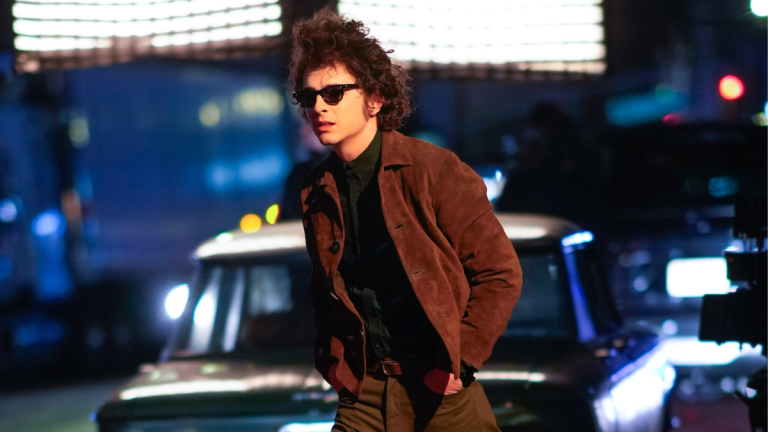 Timothée Chalamet interpretando a Bob Dylan