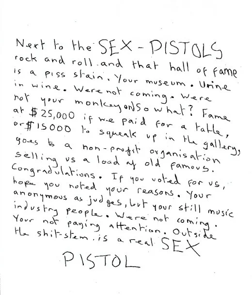 De hecho, Johnny Rotten escribió una carta manifestando su molestia por la consideración del Salón de la Fama.