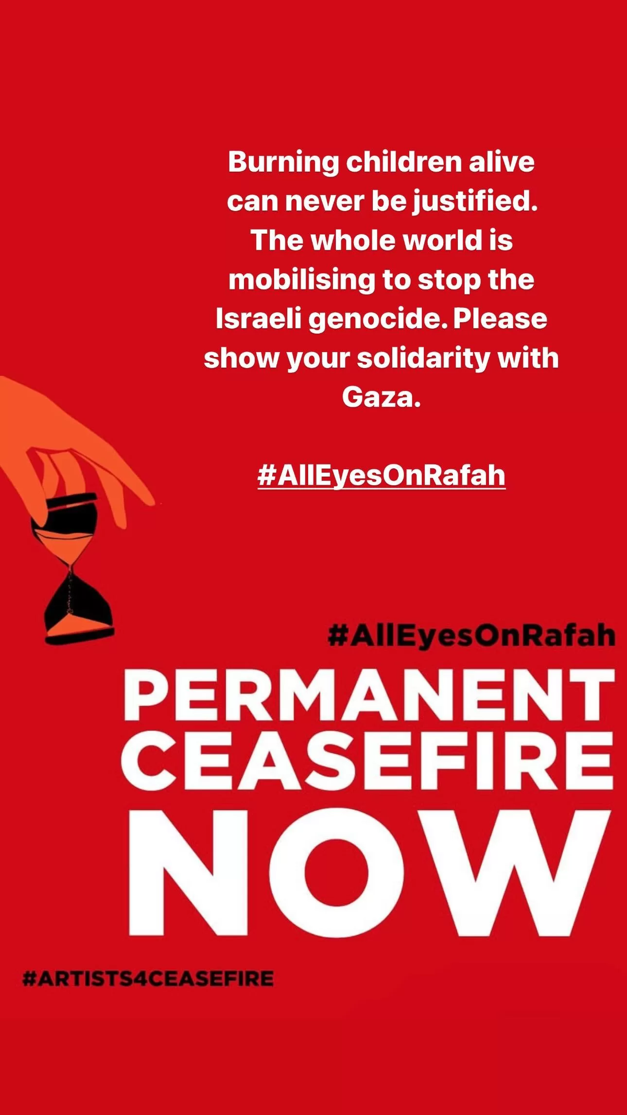 En su publicación, Dua Lipa escribió: "Quemar niños vivos nunca puede justificarse", escribió en sus Historias de Instagram. "El mundo entero se está movilizando para detener el genocidio israelí. Por favor, muestren su solidaridad con Gaza. #TodosLosOjosEnRafah”.
