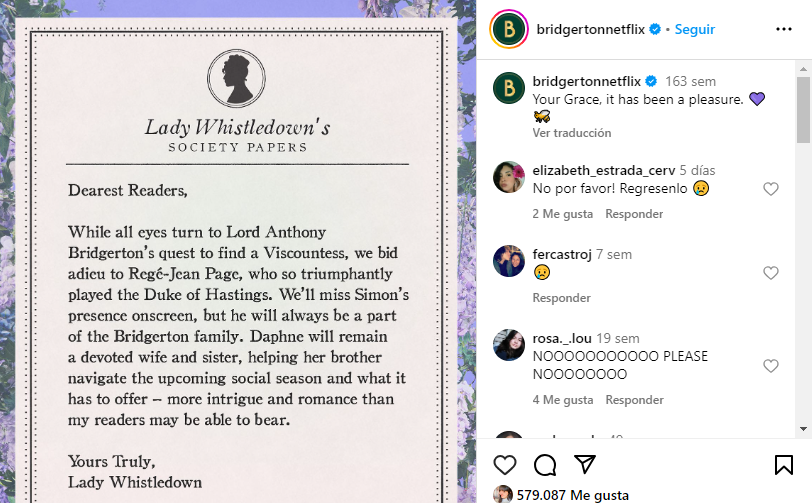Esta decisión fue confirmada incluso por vía Instagram, en el que se dijo: "Mientras todos los ojos se vuelcan a Lord Anthony Bridgerton por su búsqueda de viscondeza, nos despedimos de Regé-Jean Page, quien interpretó triunfalmente al Duque de Hastings".