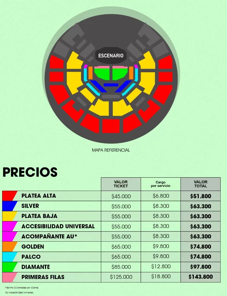 Respecto a los precios, estos van desde los $51.800 en Platea Alta, hasta $143.000 en las primeras filas, considerando el Cargo por Servicio. Todos los tickets del recinto cuentan con accesibilidad universal.