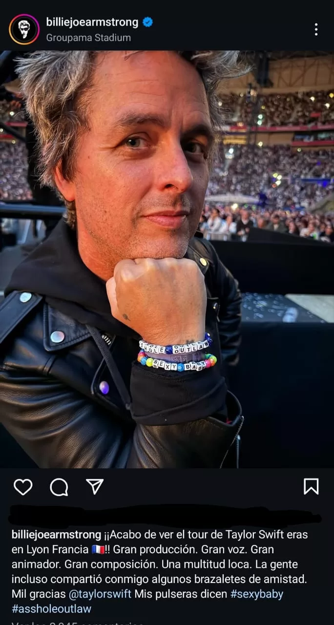 "Acabo de ver la gira de Taylor Swift en Lyon, Francia. Gran producción, gran voz, gran artista. Gran composición de canciones. Un millón de gracias Taylor Swift. Mis pulseras dicen #sexybaby #assholeoutlaw", indicó el vocalista de Green Day.