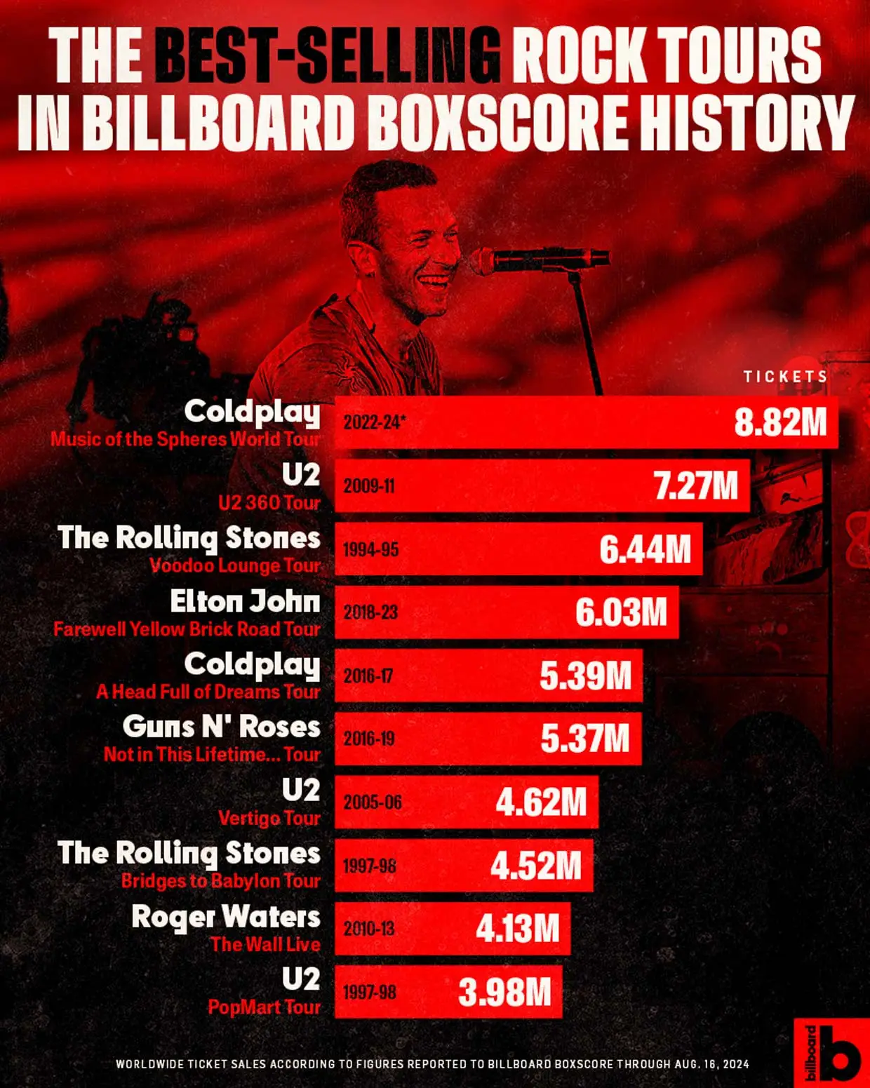 En cuanto a la venta de entradas, Coldplay figura con el titulo de mejor artista de rock de todos los tiempos desde enero. Si bien el récord de ingresos se ha renovado con más frecuencia, en parte debido a la inflación y a un mercado de venta de entradas en constante aumento, el récord de asistencia ha sido más sólido.