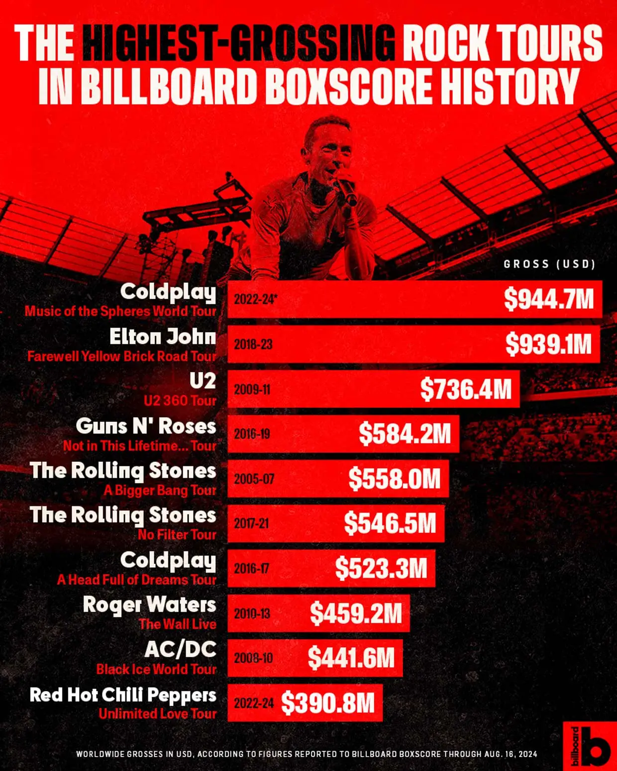 Así, según anunció Billboard, Music of the Spheres ha recaudado 945,7 millones y vendido 8,8 millones de entradas desde su lanzamiento en marzo de 2022. Este resultado lo convierte en el tour más taquillero y con mayores ventas del rock.