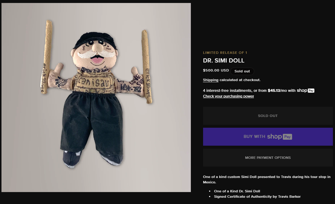 El muñeco fue puesto en venta en la página de Travis a 500 dólares, 472.485 pesos chilenos aproximadamente. "Único en su tipo, muñeco Simi personalizado se le presentó a Travis durante su visita a México en la gira. Muñeco único, Dr. Simi con certificado de autenticidad firmado por Travis Barker", dice la descripción del producto.