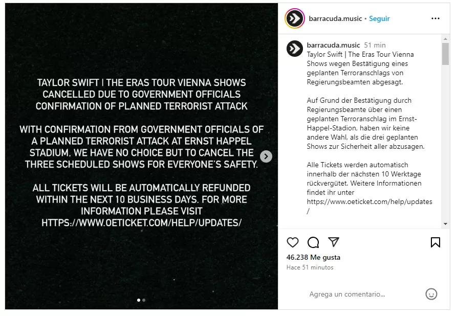 El objetivo del ataque era el Estadio Ernst Happel de Viena, según las autoridades. Lugar donde Swift tiene previsto actuar este jueves, viernes y sábado por la noche como parte de la gira The Eras Tour.