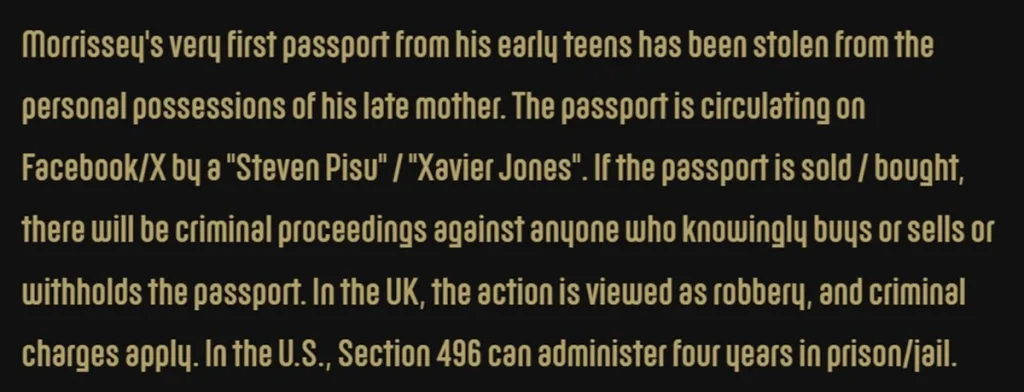 "El pasaporte está circulando en Facebook/X por un 'Steven Pisu'/'Xavier Jones'. Si el pasaporte se vende o se compra, se iniciarán procedimientos penales contra cualquier persona que lo compre, venda o retenga a sabiendas.", escribió Morrissey.