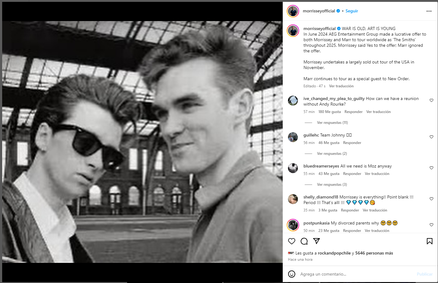 "En junio de 2024, AEG Entertainment Group hizo una oferta lucrativa tanto a Morrissey como a Marr para realizar una gira mundial como ‘The Smiths’ durante 2025" dice la entrada titulada La guerra es antigua, el arte es joven.