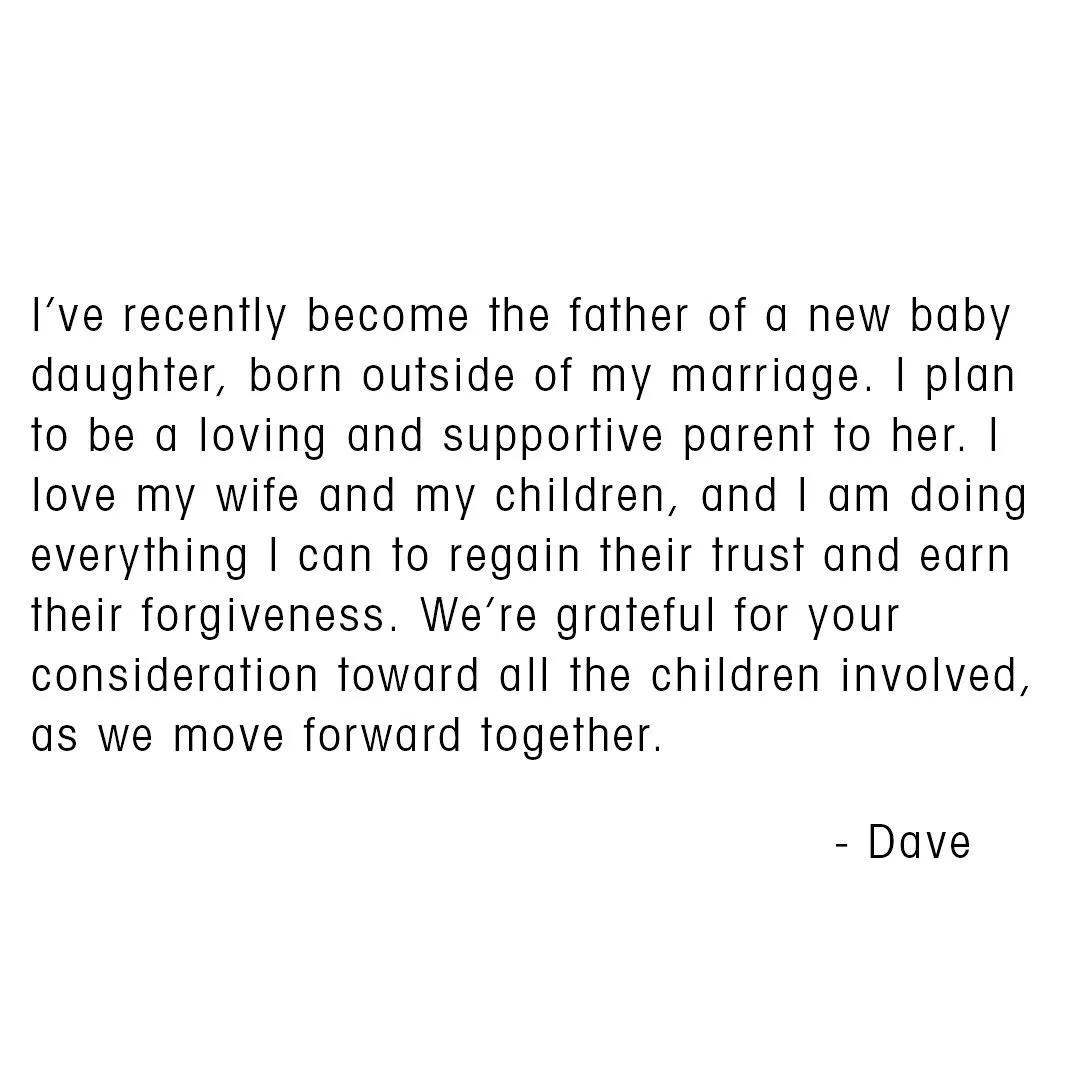 Grohl, de 55 años, escribió en su declaración que "Me he vuelto padre de una bebé, nacida fuera de mi matrimonio. Planeo ser un padre amoroso y comprensivo para ella. Amo a mi esposa y mis hijas, y estoy haciendo todo lo que pueda para recuperar su confianza y ganarme su perdón. Estamos agradecidos por su consideración hacia todos los niños involucrados, mientras avanzamos juntos en esto".