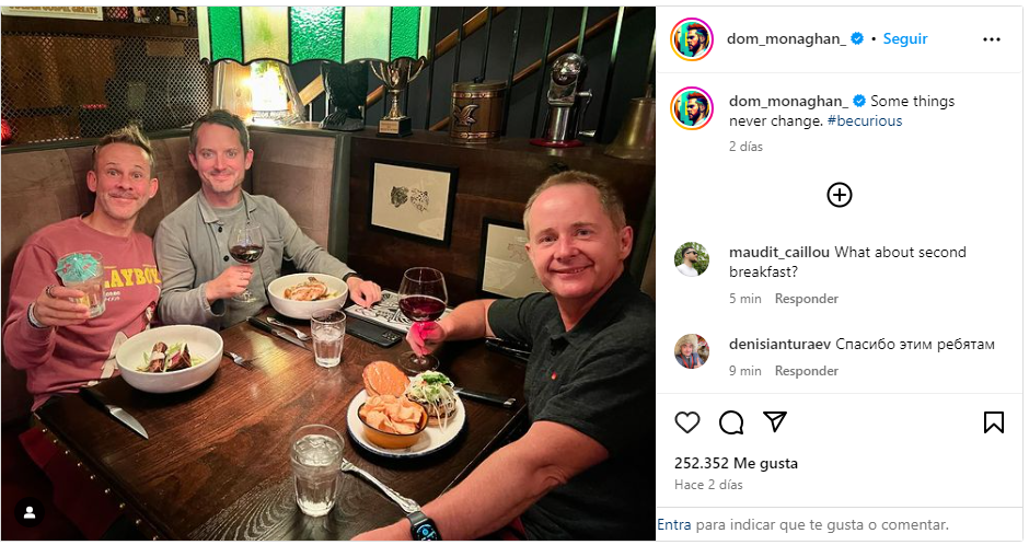 Dominic Monaghan, quien interpreta a Merry en la saga, publicó una foto en su Instagram, donde se ve a Elijah Wood (Frodo) y Billy Boyd (Pippin) alzando sus copas para un merecido brindis. Los tres participaron de la adaptación al cine del director Peter Jackson, de las aclamadas novelas de fantasía de JRR Tolkien.