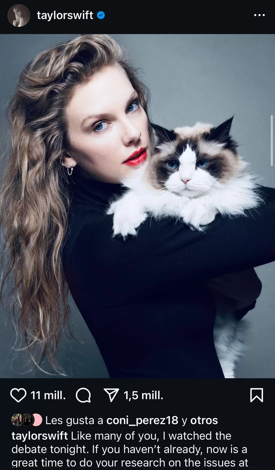 A través de Instagram la cantante compartió: “Como muchos de ustedes, vi el debate de esta noche. Si aún no lo han hecho, ahora es un buen momento para investigar los temas en cuestión y las posturas que adoptan estos candidatos sobre los temas que más les importan", comenzó Taylor Swift.