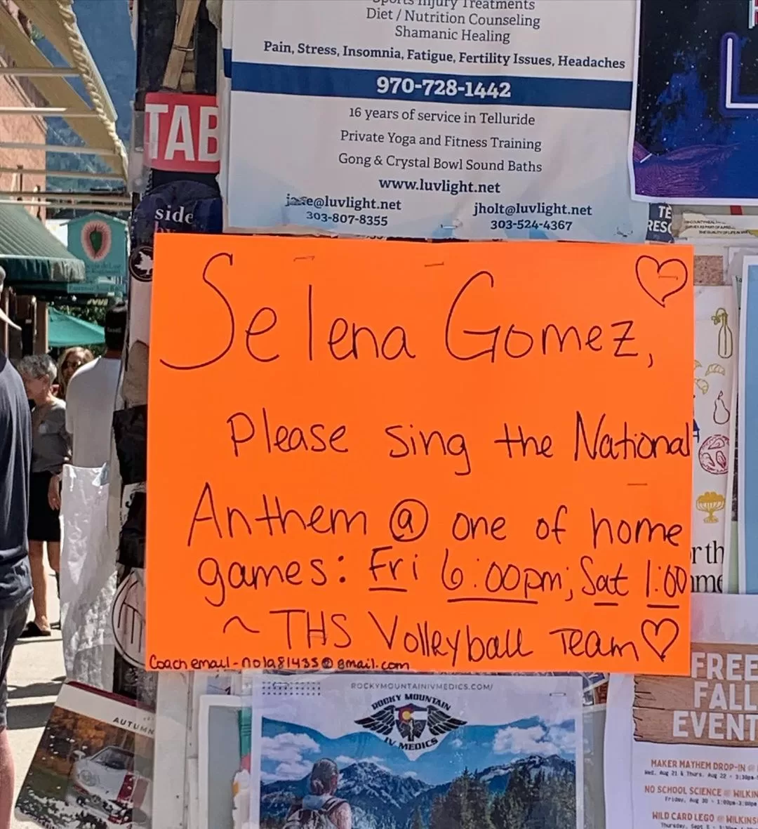 "Selena Gomez, por favor canta el Himno Nacional en uno de los partidos en casa", decía el cartel, con fecha y hora de dos partidos del equipo, además del correo de contacto de la entrenadora.