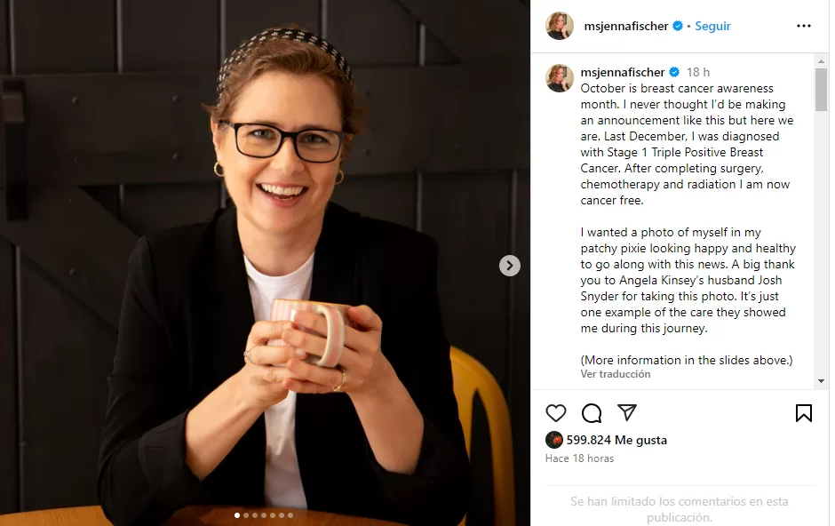Una de las causas de muerte más frecuente en mujeres tiene que ver con el cáncer de mama que no se detecta a tiempo. La recordada actriz de The Office, Jenna Fischer, reveló que padece la enfermedad y hace un llamado para que las mujeres se chequeen frecuentemente.