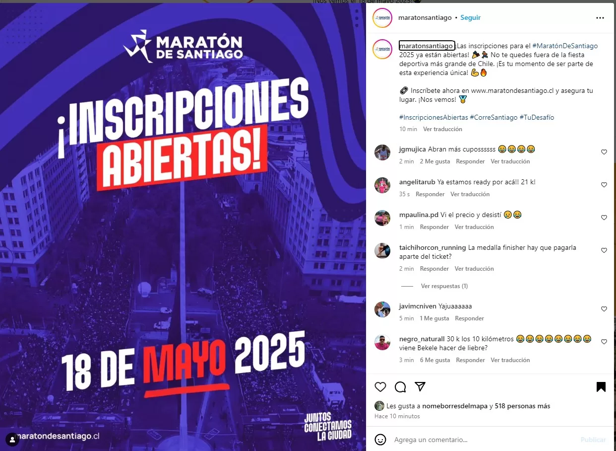 Si quieres asegurar tu cupo y aprovechar precios preferenciales en esta primera etapa de inscripciones, debes registrarte completando el formulario disponible en el sitio web oficial: www.maratondesantiago.cl.