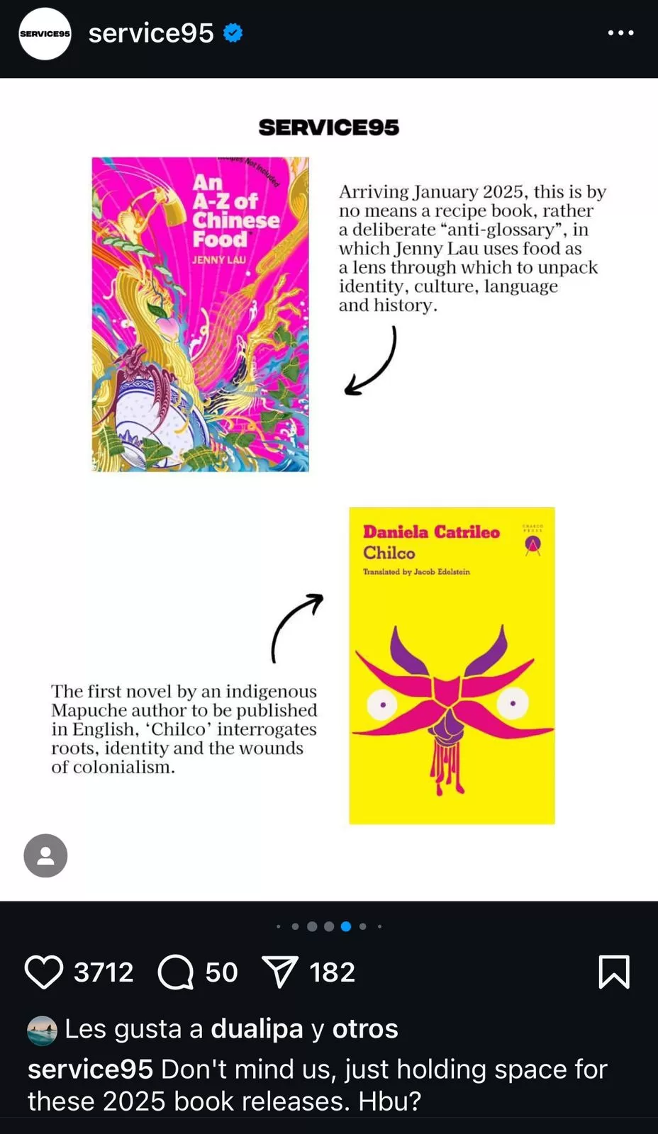 Uno de los escritos que aparece en la última publicación de la artista es Chilco, novela de la chilena Daniela Catrileo. Así, en el post podemos ver la portada amarillo y rojo con símbolos, acompañada de la recomendación: "Es la primera novela de un indígena mapuche en ser publicada en inglés. Chilco cuestiona las raíces, la identidad y las heridas del colonialismo".