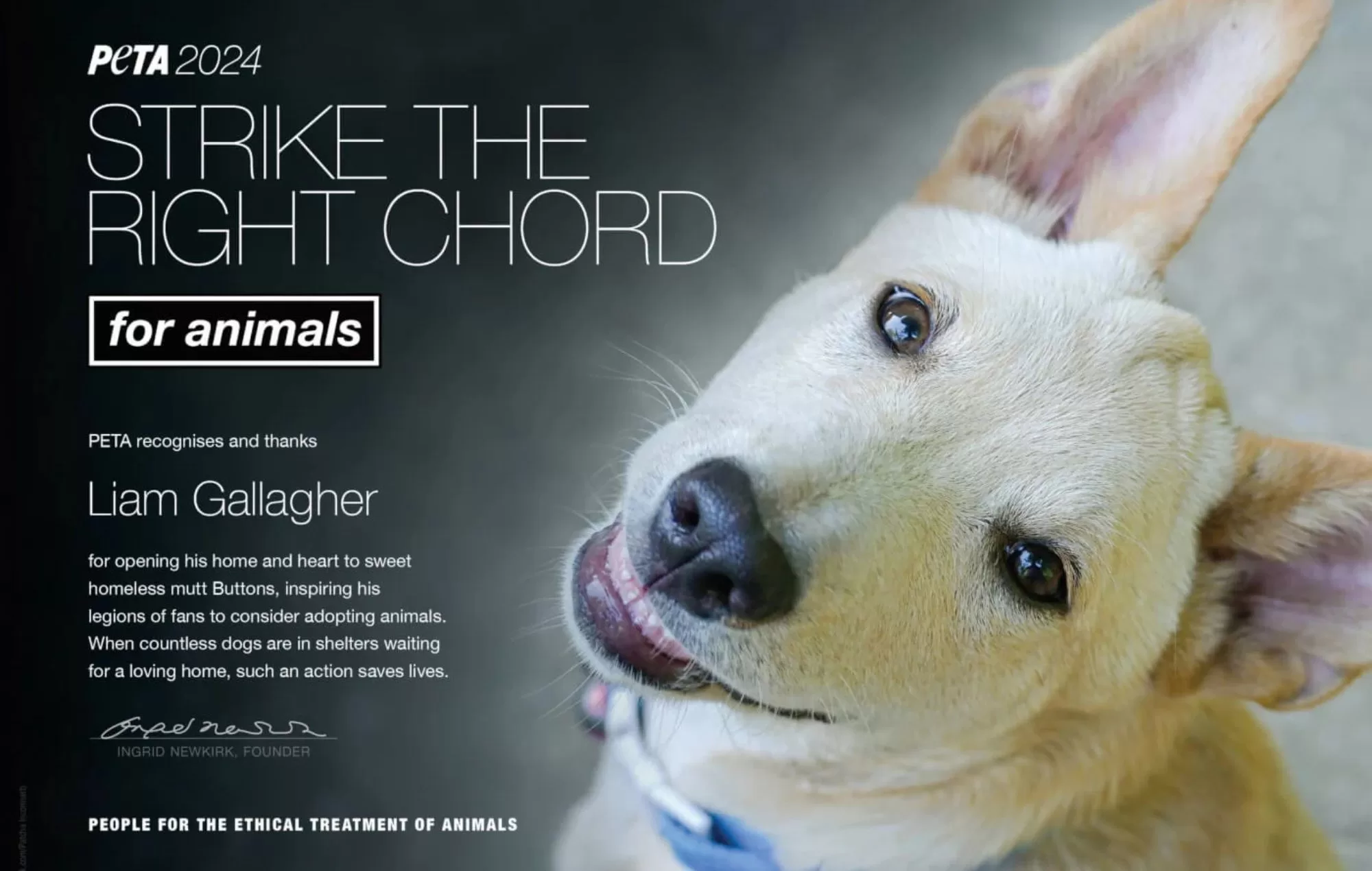 En reconocimiento por la labor realizada por el frontman de Oasis, que aparte de su aporte benéfico, generó conciencia al adoptar a Buttons, se le otorgó el premio Strike the Right Chord for Animals de PETA.