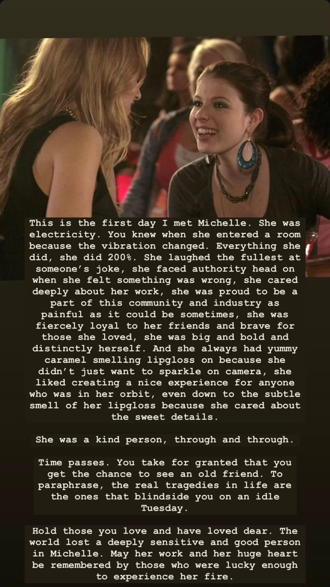 “Era una persona amable de pies a cabeza”, continuó Lively. “El tiempo pasa. Das por sentado que tienes la oportunidad de ver a un viejo amigo. Parafraseando, las verdaderas tragedias de la vida son las que te sorprenden un martes de ocio. Aprecia a quienes amas y has amado. El mundo perdió a una persona profundamente sensible y buena en Michelle. Que su trabajo y su enorme corazón sean recordados por aquellos que tuvieron la suerte de experimentar su fuego”.