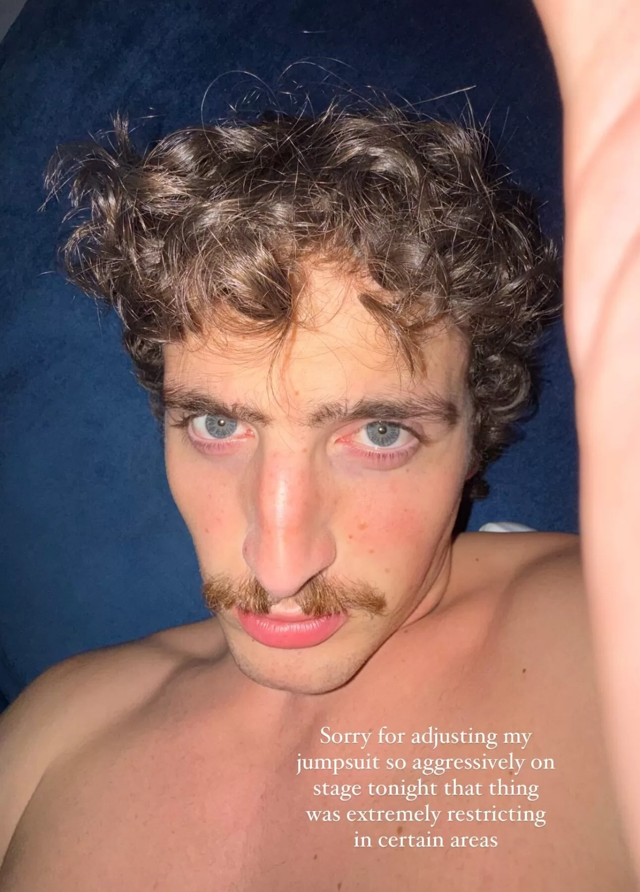 Ahora, ha recurrido a las redes sociales para explicar por qué hizo ese movimiento durante el set y ha ofrecido una disculpa distendida a los espectadores. “Perdón por ajustar mi traje de manera tan agresiva en el escenario esta noche”, escribió el cantante en sus Stories, y también compartió una selfie. “Esa cosa me restringía mucho en ciertas áreas”.