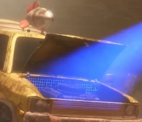 En esta escena donde sale el icónico auto, pero ahora ya vuelto una chatarra, se muestra a Eva escanéandolo.