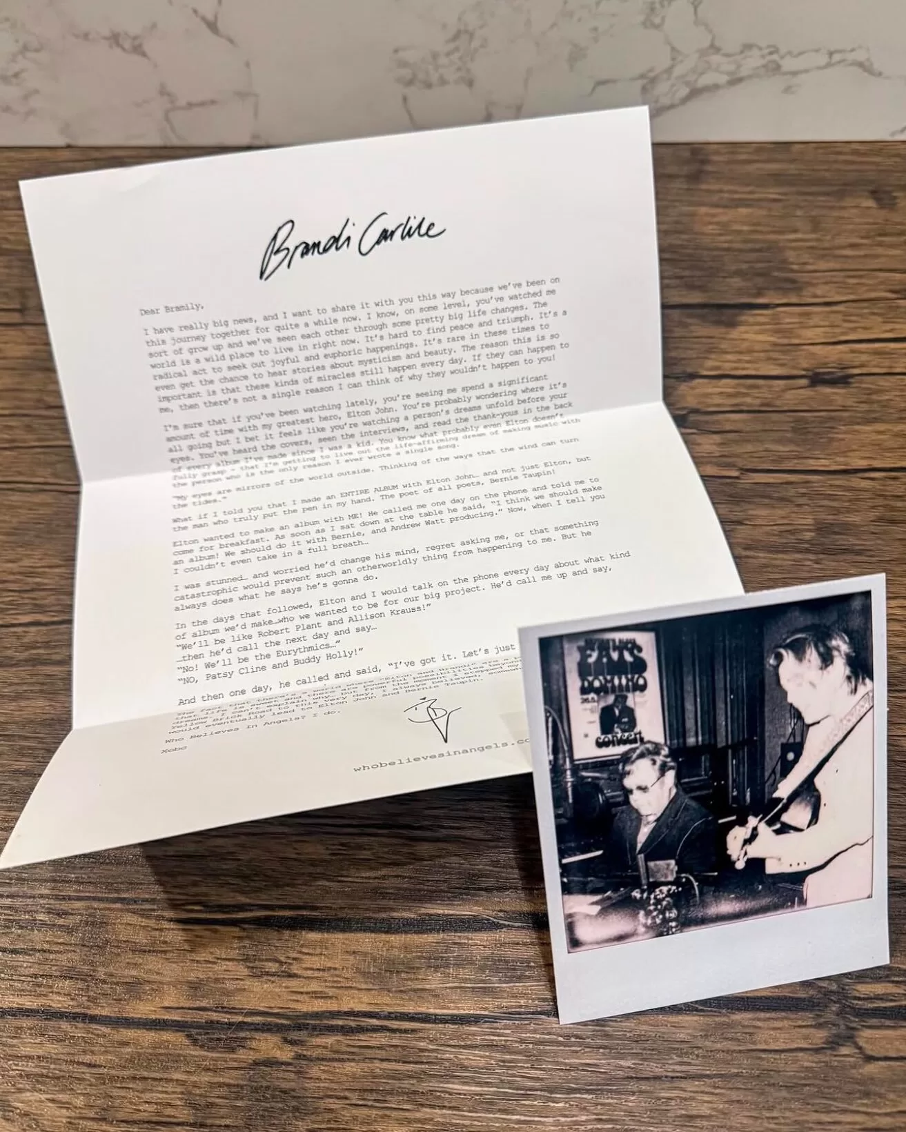 Según capturas de pantalla de la carta de John publicadas en foros de fans y reportadas a través de Clash, la leyenda del pop explicó que estaba trabajando con Brandi Carlile después de que ella le pidiera que tocara el piano en una canción en la que estaba trabajando. “Cuando nos conocimos, me enamoré de ella y conectamos de inmediato”.