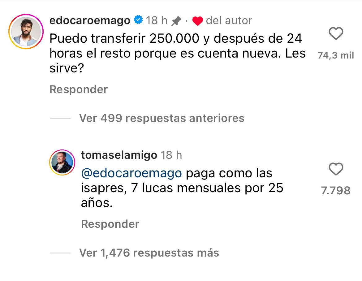 Y su amigo que lo acompañó en Viña y coanimador del podcast "Tomás Va a Morir", Tomás Leiva añadió: "Paga como las isapres, 7 lucas mensuales por 25 años.