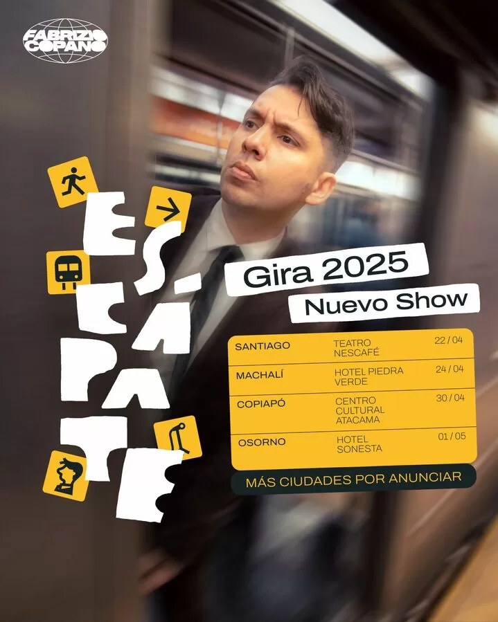 En concreto, Fabrizio Copano llegará a los escenarios chilenos con la rutina ESCÁPATE. Se trata de un espectáculo que es una especie de invitación a huir, aunque sea por un par de horas, de esta era caótica y ridícula. Funciones de stand-up dinámico, con casi dos horas de comedia afilada, interacciones en vivo y sorpresas que hacen de cada función una experiencia única.