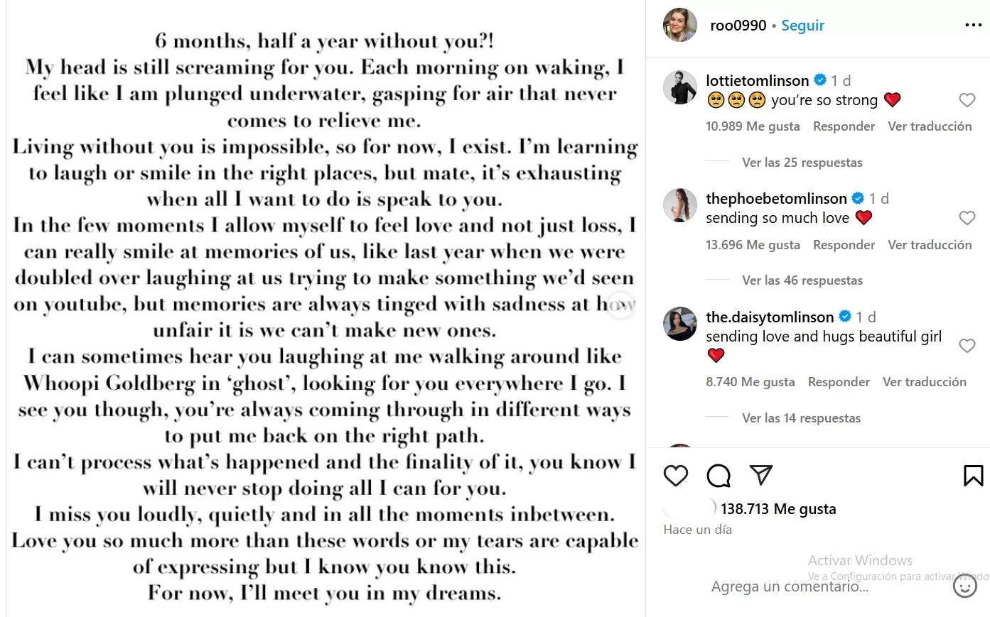 "En los pocos momentos que me permito sentir amor y no solo pérdida, puedo sonreír de verdad al recordarnos, como el año pasado, cuando nos partíamos de risa intentando hacer algo que habíamos visto en YouTube, pero los recuerdos siempre están teñidos de tristeza por lo injusto que es no poder crear nuevos", se lamentó la hermana del músico.