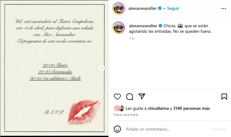 "Ud está invitado al Teatro Caupolicán, este 11 de abril, para disfrutar una velada con Alex Anwandter", se lee en una foto que simula una carta e incluye un beso del artista.