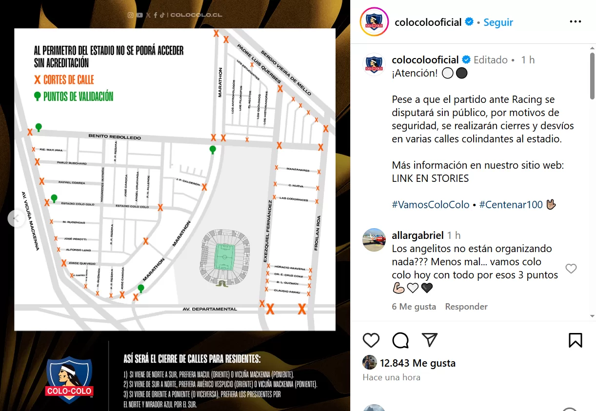 Cabe destacar que en el sector cercano al Estadio Monumental David Arellano solo podrá ser transitado por las delegaciones de Colo Colo y Racing, miembros Conmebol y prensa acreditada.