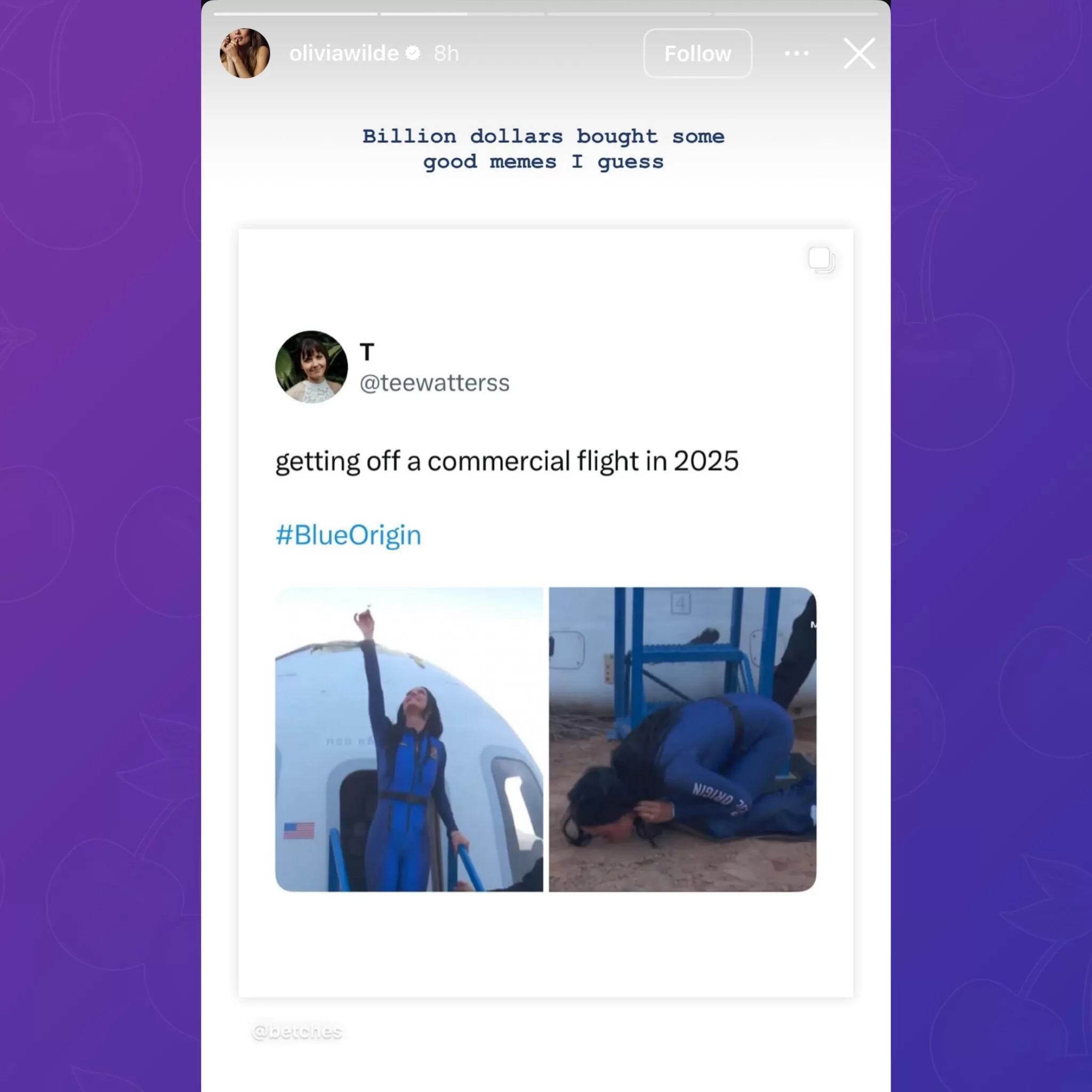 De forma similar, la actriz y modelo Olivia Munn declaró: "¿Qué están haciendo? Sé que probablemente no sea lo más genial. Pero hay tantas otras cosas importantes en el mundo ahora mismo. Sé que probablemente sea desagradable, pero es que cuesta muchísimo dinero ir al espacio, y hay mucha gente que ni siquiera puede permitirse comprar huevos".