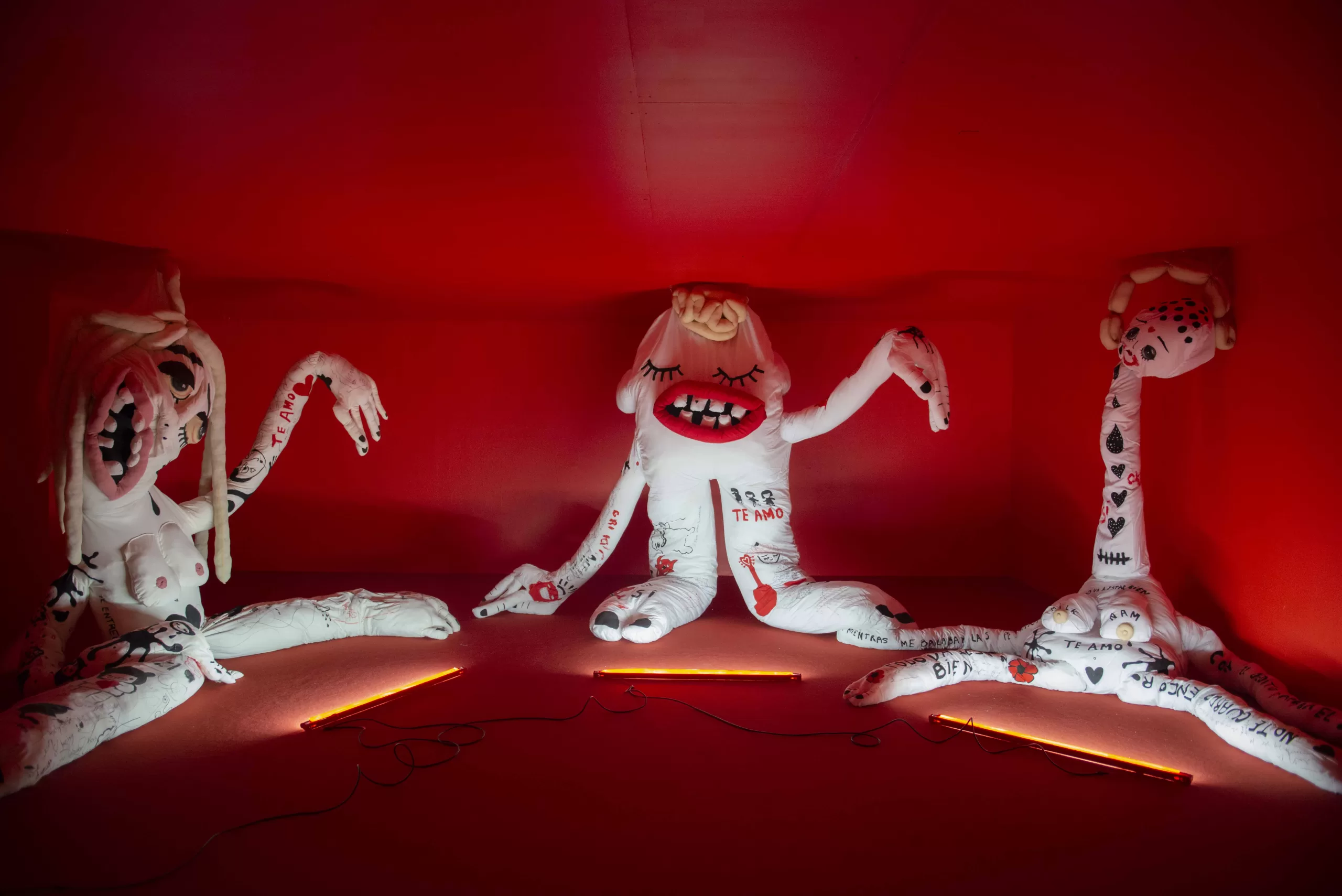 Te Amo. Mon Laferte Visual, inaugurada para la versión 2023 del Festival Internacional Teatro a Mil, es una exposición que reúne, a través de pinturas, dibujos, poemas, videos, bordados y figuras tridimensionales, todo el imaginario visual de Mon Laferte, poblado de mujeres cuyo dolor aparece a través de sus miradas; monstruos que, a la vez, evocan ternura; formas, colores y retratos de quienes habitan América: mujeres de diferentes comunidades, entre ellas mujeres privadas de libertad.