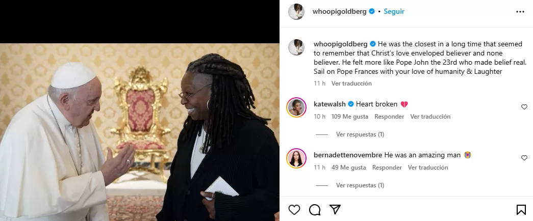 De forma similar, la ganadora del Oscar Whoopi Goldberg le dedicó un mensaje en su Instagram. "Era el más cercano en mucho tiempo que parecía recordar que el amor de Cristo envolvía a creyentes e incrédulos. Se sentía más como el Papa Juan XXIII, quien hizo realidad la fe. ¡Sigue adelante, Papa Francisco, con tu amor por la humanidad y tu risa!", escribió.