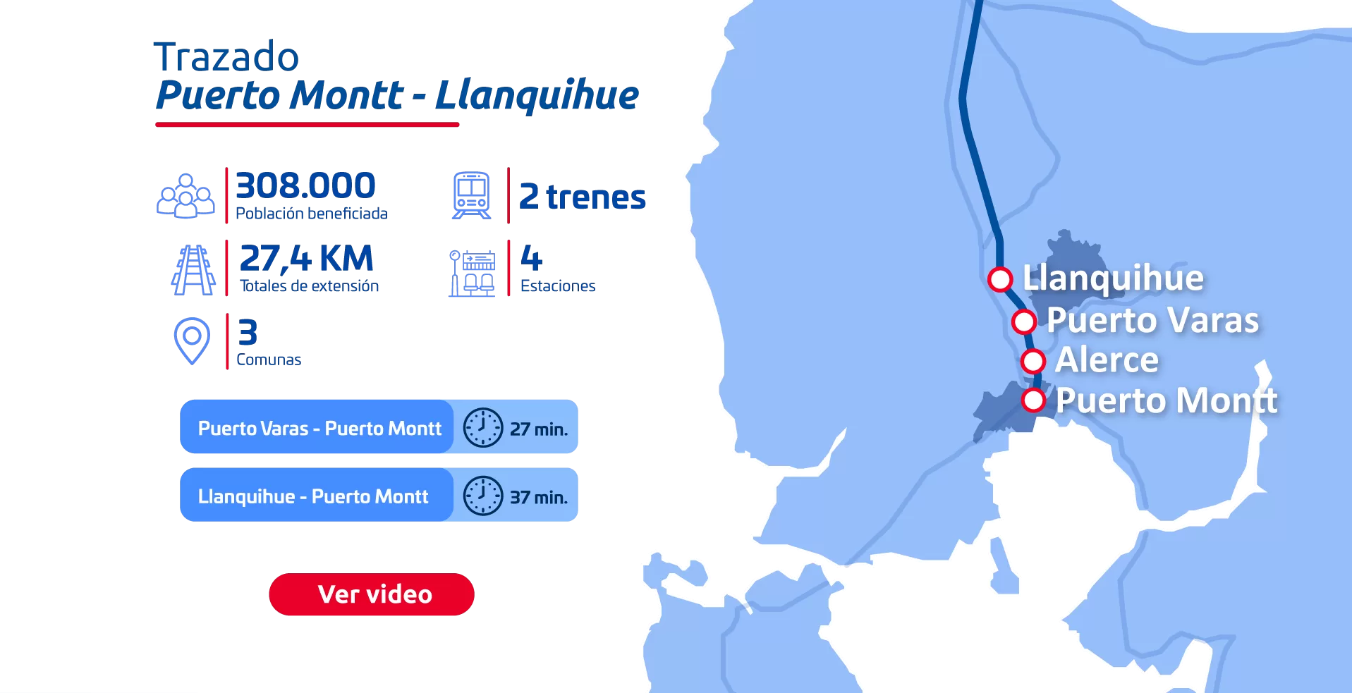 En concreto, el nuevo tren conectará las comunas de Llanquihue, Puerto Varas y Puerto Montt a través de un recorrido de 27 kilómetros. Cabe destacar que con cuatro estaciones, el proyecto reduce el tiempo de viaje de los usuarios entre 27 y 37 minutos.