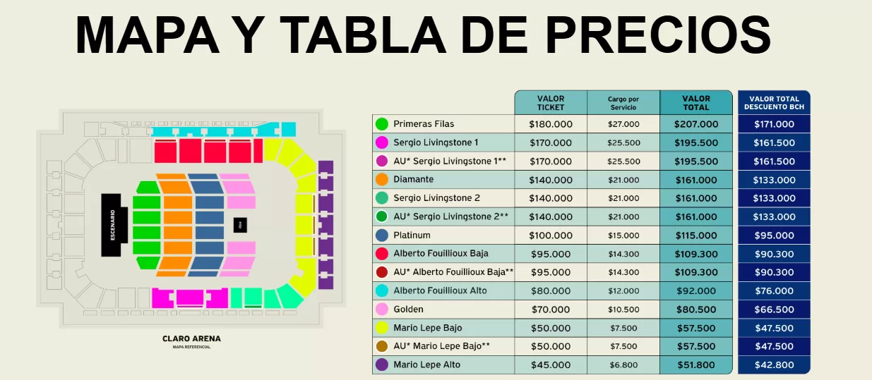 A diferencia de otros conciertos, los sectores tienen otros nombres, pues el recinto es nuevo y solo tiene agendados algunos conciertos. Es así como aparecen sectores como Primeras Filas, Sergio Livingstone 1, Alberto Foullioux Baja, Golden y Mario Lepe.