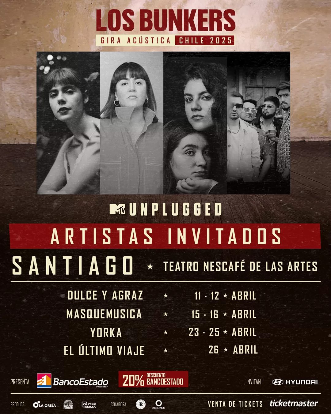 Esta semana Los Bunkers comenzarán su residencia de 25 conciertos en el Teatro Nescafé de las Artes, un hito inédito en la historia de la música chilena. Los shows que tendrán punto de partida a partir del 11 de abril hasta fines de junio, contarán con artista invitados abriendo cada noche: Dulce y Agraz (11 y 12 de abril), Masquemusica (15 y 16 de abril), Yorka (23 y 25 de abril) y El Último Viaje (26 de abril).