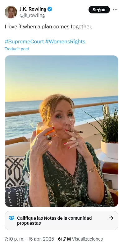 Tras el anuncio de la decisión, la autora de Harry Potter publicó una foto suya en X/Twitter levantando una copa y fumando un puro, y comentó: "Me encanta cuando un plan sale bien".