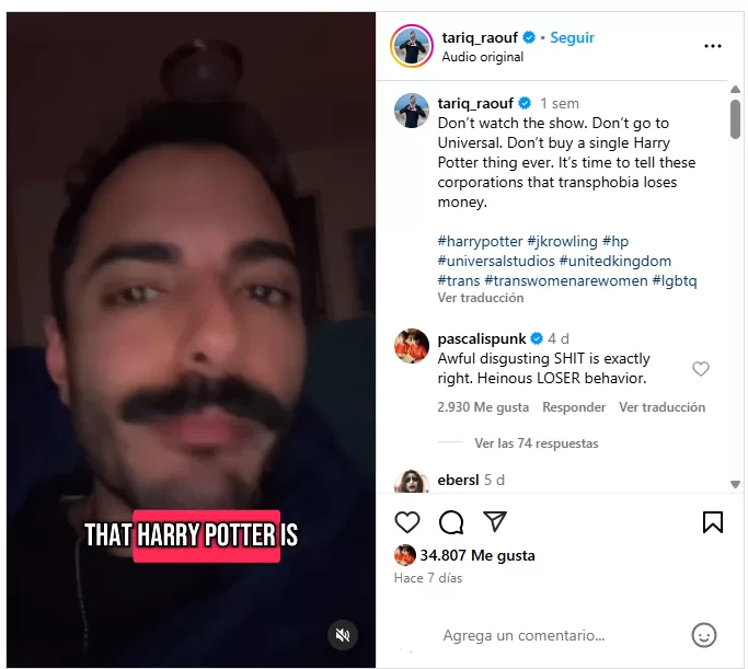 El escritor y activista Tariq Ra'ouf publicó un vídeo en redes sociales instando a la gente a evitar proyectos inspirados en la obra de Rowling, a la luz de lo que describió como "una mierda horrible y repugnante" que ella genera.