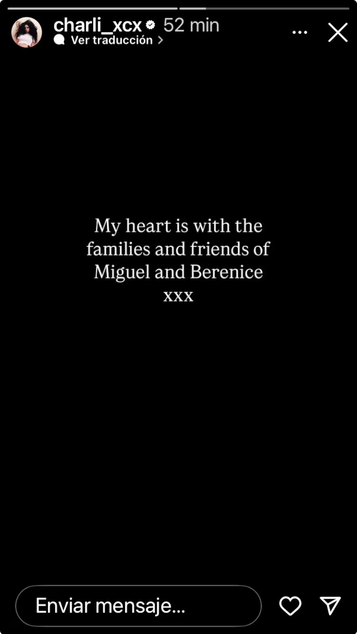 A través de una historia de Instagram, la cantante escribió: "Mi corazón está con los familiares y amigos de Miguel y Berenice. Besos, besos, besos".