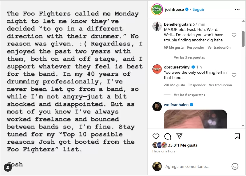 "Pero como la mayoría de ustedes saben, siempre he trabajado como freelance y he estado cambiando de banda, así que estoy bien. Estén atentos a mi lista de las 10 posibles razones principales por las que Josh fue expulsado de Foo Fighters” concluyó bromeando.