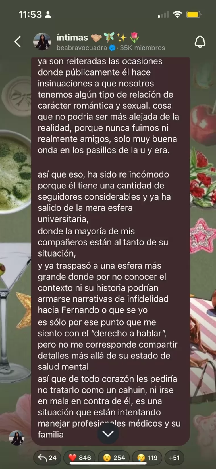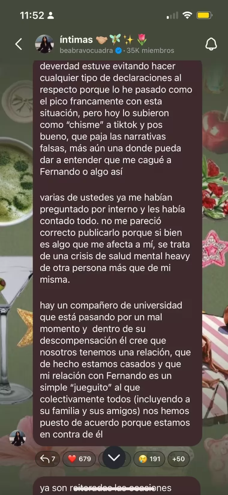 “Varias de ustedes ya me habían preguntado por interno y les había contado,. No me pareció correcto publicarlo porque si bien es algo que me afecta a mí. Se trata de una crisis de salud mental heavy de otra persona más que de mí misma", reveló Bea en su canal de Instagram.