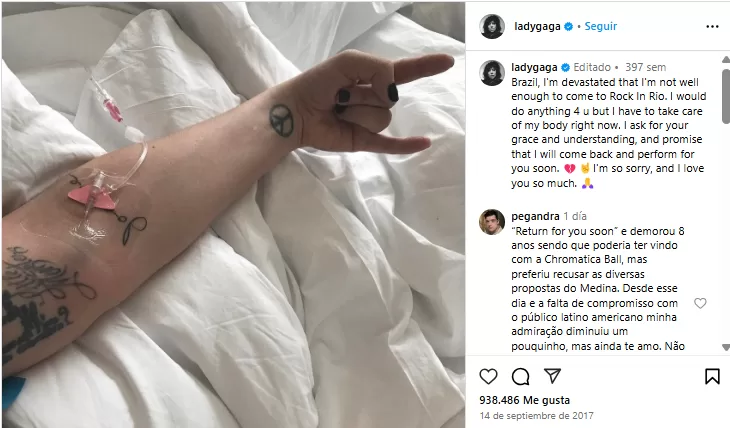 A horas de su presentación en el prestigioso festival del gigante de Latinoamérica, Lady Gaga informó que no lograría presentarse debido a un complejo estado de salud. "Brasil, estoy devastada porque no estoy lo suficientemente bien como para ir a Rock in Rio. Haría lo que fuera por ti, pero ahora mismo tengo que cuidar mi cuerpo", dijo.