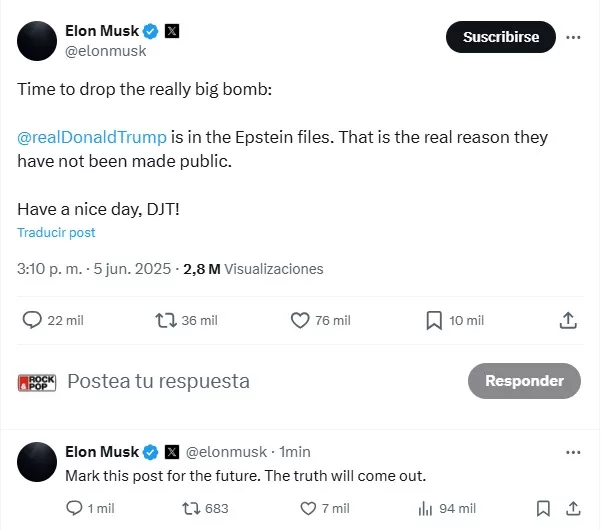 En una publicación en su plataforma de redes sociales X, Elon Musk escribió: "Es hora de lanzar la bomba: @realDonaldTrump está en los archivos de Epstein. Esa es la verdadera razón por la que no se han hecho públicos. ¡Que tengas un buen día, DJT!". Musk añadió más tarde: "Guarda esta publicación para el futuro. La verdad saldrá a la luz".