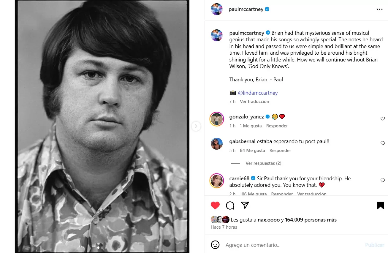 "Brian poseía ese misterioso sentido de la genialidad musical que hacía que sus canciones fueran tan dolorosamente especiales". Escribió McCartney en redes sociales este jueves, la mañana siguiente al anuncio del fallecimiento de Wilson.