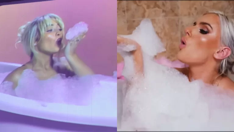 La cantante de "Espresso" también muestra versiones animada de ella, aparece en una tina con espuma, y se saca la toalla al entrar al escenario al igual que el video de Blake Monroe. Y varios usuarios en redes sociales mostraron comparaciones entre ambas presentaciones.