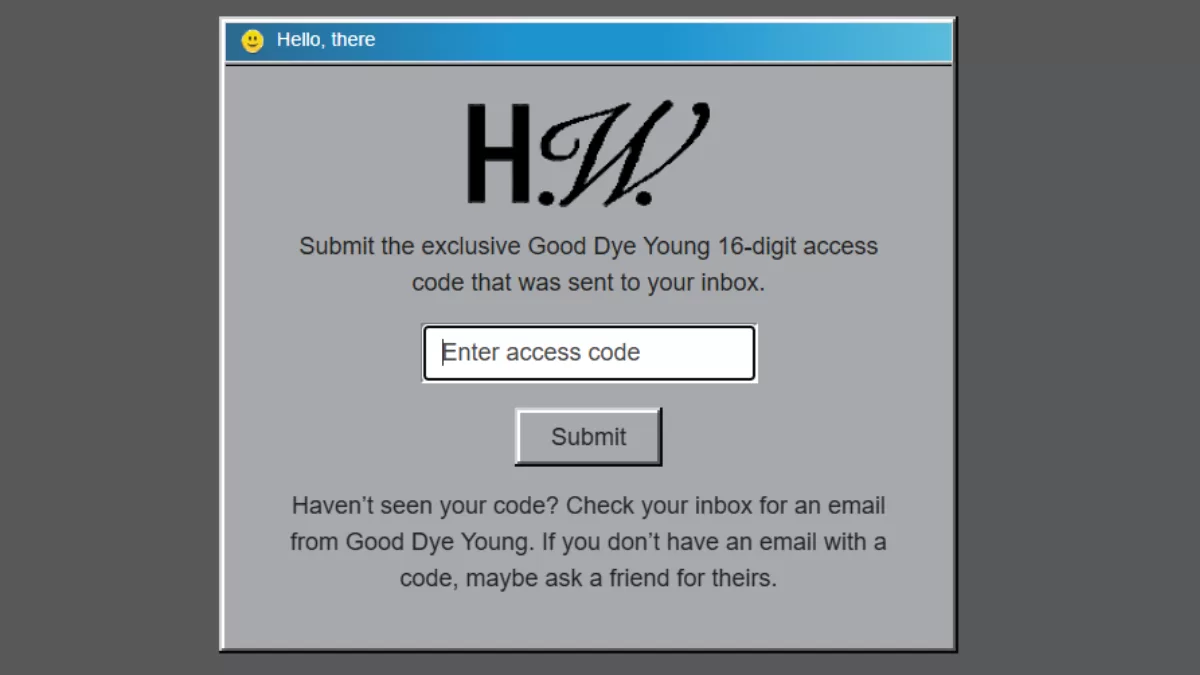 Al ingresar a la página, solo se puede ver un nostálgico aviso tipo "Windows 98". Solo está opción de ingresar una contraseña, acompañada de un texto: "Ingrese el código de acceso exclusivo de 16 dígitos de Good Dye Young que le enviamos a su bandeja de entrada", refiriéndose a la compra de la tintura. "Si no tienes un correo con el código, pídele el suyo a un amigo".